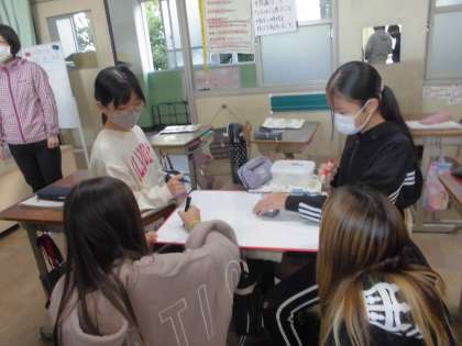今日の家庭科の授業では、自分で買い物をすることを想定した「買い物シミュレーション」を行いました。買い物のときに意識することは時と場合によって変化します。「地産地消」「値段」「産地」「個数」「好き嫌い」などなど。グループごとに、それぞれが考えるポイントを話し合いながら、買うものを決めていました。