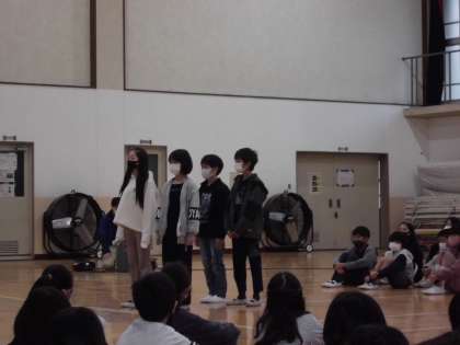 5年生は山の家で学んだことを寸劇にして全校のみんなに伝えました。