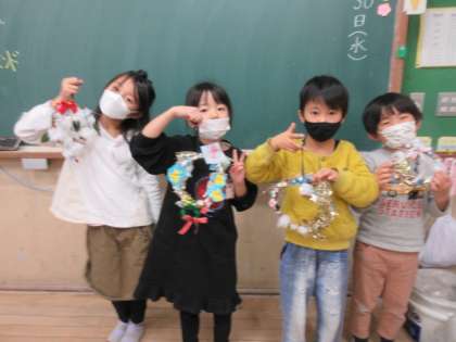 生活科で育てたあさがおのくきで、あさがおリースを作りました。綿や飾りをたくさんご用意していただいて、ありがとうございました。とっても素敵なリースができました。教室に掲示した後、持ち帰ります。楽しみにしておいてください。
