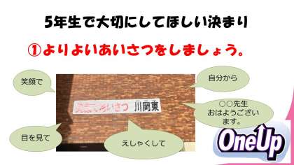 5年生の学年目標は、「OneUp↑」です。今まで頑張ってきたことや挑戦したことを自信に変えて、さらに一歩進んでほしいという願いと、自分から進んで行動(一歩を踏み出してほしい)という思いから、この目標にしました。