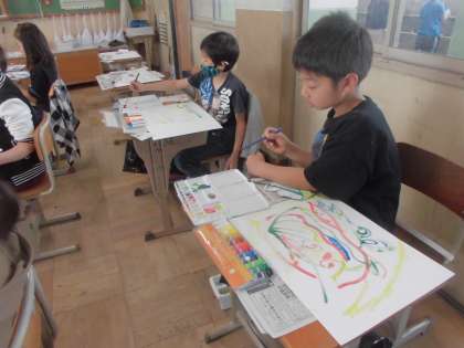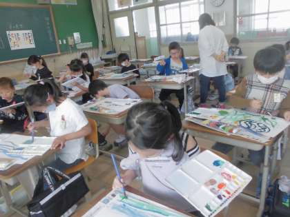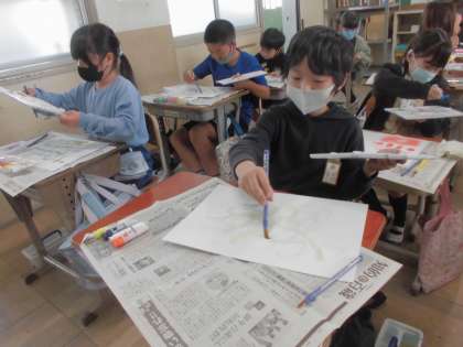 図画工作科「絵のぐ+水+ふで=いいかんじ」の学習の様子です