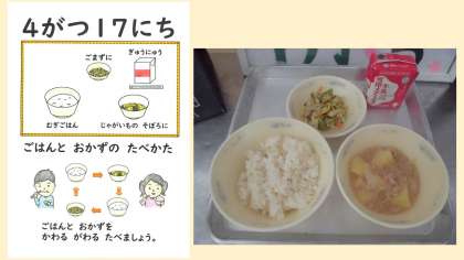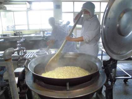 今日の「じゃがいものそぼろ煮」のじゃがいもは、「とくのしま」と「おきのえらぶじま」から届きました。とても柔らかく、調理員さんたちは煮崩れないように優しく丁寧に調理してくださいました。