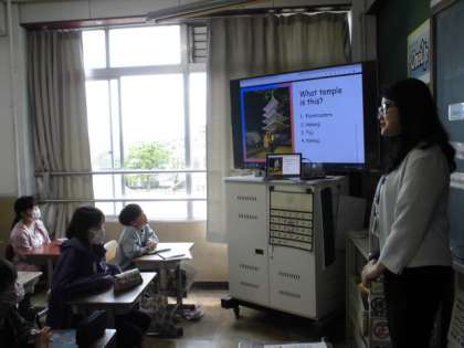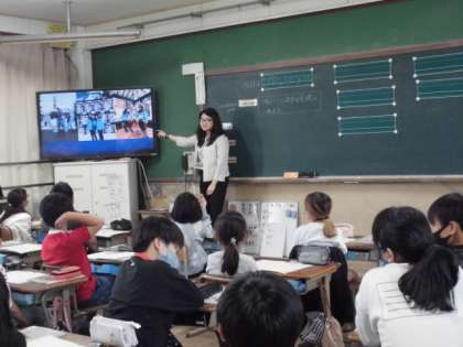 ALTの先生は、エマ先生です。単元で使う表現や語句を使いながら、楽しい自己紹介クイズをしてくだりました。