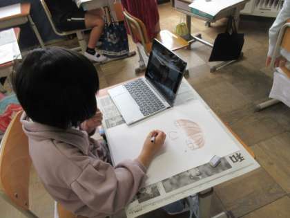 図画工作科で自画像を描きました。GIGA端末で自分の顔を撮影して、鼻の形や目の大きさを確かめながら描きました。とても集中していたみんな。クレヨンでしっかり塗りをして完成!