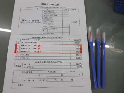 本日、絵の具セットの申しこみ封筒を配布しました。見本は28日(金)の参観・懇談会の日に2年生の廊下に展示しますので、ご覧ください。