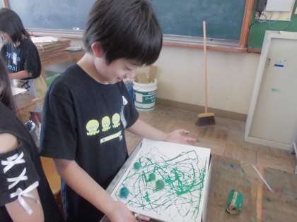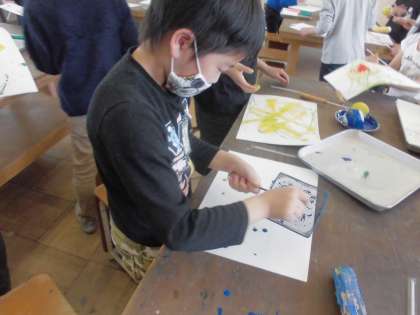 図画工作科では、図工室で「絵の具でゆめもよう」の学習をしました。