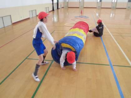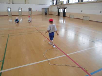 トンネルをくぐったり、ケンケンパーをしたり、縄の上をバランスをとって歩いたり。