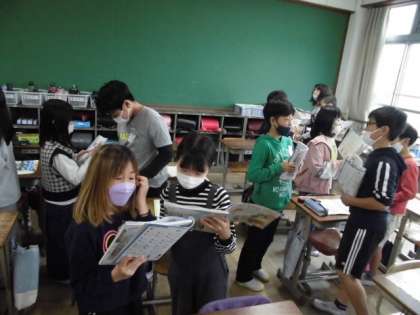 チャンツを歌ったりゲームをしたりする中で、友だちの名前のつづりをたずね合うことにも慣れてきました。自分の名前を4線に、正しく書く練習もしました。