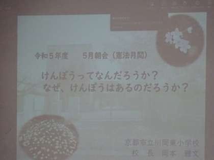 5月は憲法月間ということもあり、朝会での話のテーマは、「けんぽうってなんだろうか?なぜ、けんぽうはあるのだろうか?」でした。
