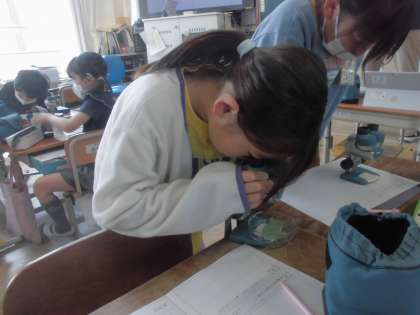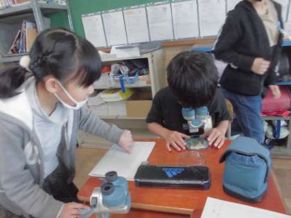 簡易顕微鏡を使うと、「すごい大きい!」「ピーナッツみたい!」と子どもたちは大興奮。