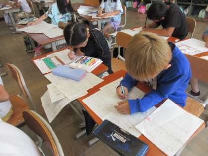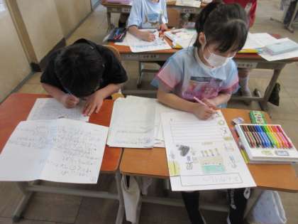 生活科で作成している教室紹介ポスター。今週中に完成できるように取り組んでいます。教室の様子が分かるように絵を描いて、その下には先週インタビューしたことをもとに文章を書いています。1年生に読んでもらうのを楽しみにしている2年生のみんなです。