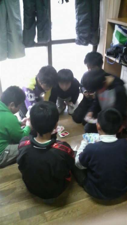雪遊びで冷えた体を温めながら,部屋で楽しく過ごしています。