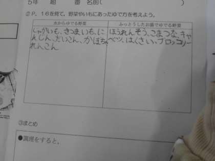「水からゆでる野菜」、「湯からゆでる野菜」を仲間分けすると、