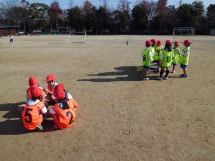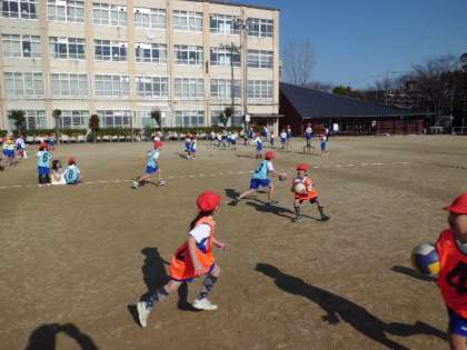 「もっと早く!」や「前に走って!」などお互いに声をかけあいながら,試合をしています。
