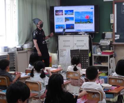 1年生の教室では沖縄にちなんだ画像と音楽を流しながら給食を食べていました。