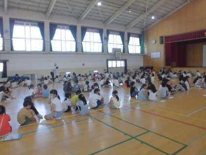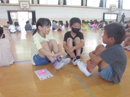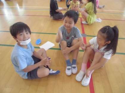 今日は学校案内や遠足、ニコニコタイムで一緒に活動する1年生と『初めまして!』会をしました。プレゼントを持っていった2年生は、お兄さん・お姉さんらしく振る舞おうと意気込んでいました。体育館で、お互いに自己紹介をした後、2年生が1年生に好きな食べ物や好きなスポーツなどを優しく聞いていました。お楽しみタイムでは『なかよしじゃんけん』をして、1年生とハイタッチ!少し仲が深まった1時間でした。