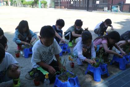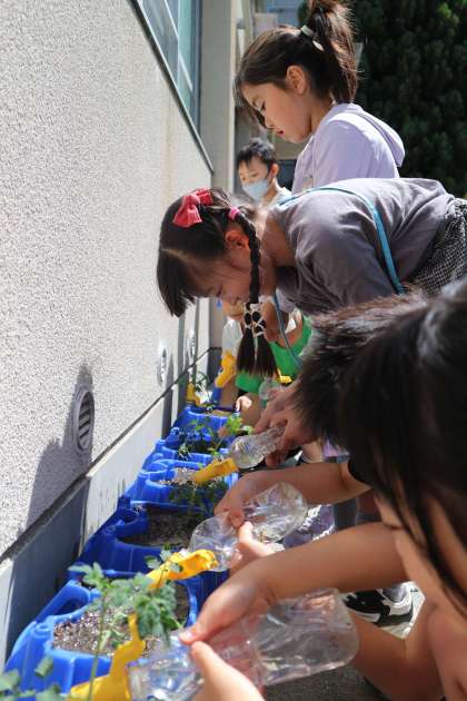 植える時には、傷つけないように優しく植えてあげていて、最後には「大きくなぁ〜れ」「たくさん実をつけてね」と言いながら水をかけてあげていました。