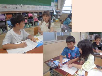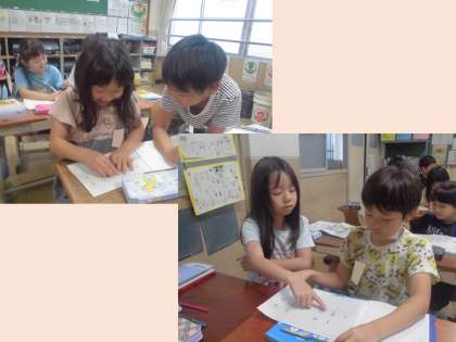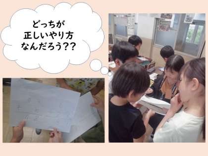 算数は筆算の単元に入りました。今日は「4+23」や「7+33」など、少し難しい筆算をどのように書いて解いたらいいのかを考えました。ペアで考えをまとめた後に、ペア同士で考えた意見をぶつけ合います。自分たちの意見の自信を深めるもよし。相手の意見を聞いて理解するもよし。話し合いの力は無限大です。「一の位」「十の位」「くり上がり」などの言葉を使いながら、うまく説明していた子どもたちでした。