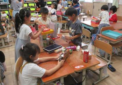 大きさも形も違うものを組み合わせて、高く積むのは大変そうでしたが、友達と協力しながら活動することができました。