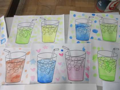 今日は、初めて絵の具を使いました。たくさんある色の中から2色選び、太筆でジュースの絵を塗りました。