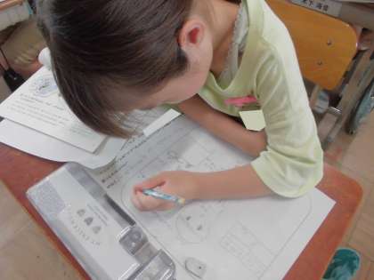 国語は『あったらいいな、こんなもの』という単元を進めています。ドラえもんの秘密道具のように、実際にはないけれど、自分がやってみたいことを叶えるため、困っていることを解決するために、ほしい道具について考えます。そして、自分で考えたことをもとに、質問をし合って、アイデアを広げていきます。大きさや色、できることについて、「どんな大きさですか?」「どのようなことができますか?」と質問しました。次は発表に向けて、語尾に「〜です。」「〜ます。」をつけて言う練習をします。