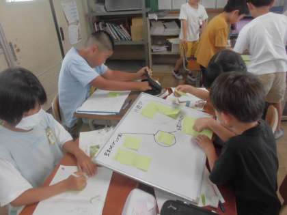「ふだん子どもだけではできないことをして、しぜんとふれ合うなら、どんなものを持っていくか」という目的に沿ってグループで話を進めました。