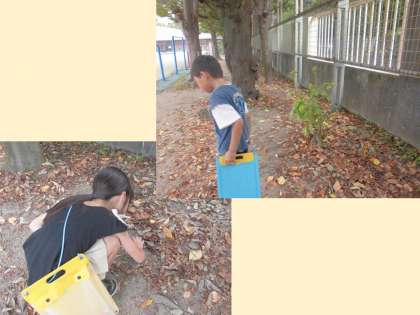 2年生の生活は『小さな友だち』という単元を進めています。落ち葉を掻き分けたり、草むらを捜索したりしていると、そこを住処にする生きものたちを見つけることができます。コオロギやダンゴムシ、バッタやカブトムシの幼虫などなど・・・小さな生きものをしばらく飼ってみて、何を食べるのか、どんな動きをしているかなどを観察していきます。『小さな友だち』はどのように過ごしているのでしょうか?