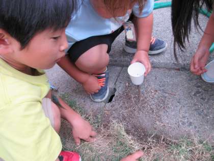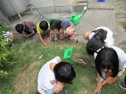 など、知っていることを出し合って、ダンゴムシを探しに行ったみんな。オスとメスの違いや、赤ちゃんの特徴など、学習したことをもとに相談しながら準備をしているみんなでした。