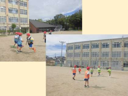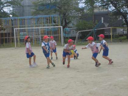 パスゲームのゲーム編です。少しですが涼しくなってきたので、パスゲームの試合をしてみました。パスをする人だけでなく、パスを受ける側がパスをもらいやすい場所に動いたり、しっかりキャッチをすることが大切だと気付いた子どもたちは、縦横無尽に動きまわってパスをつないでいました。バスケットボールの時にも、この動きを使って、上手になってほしいと思います。