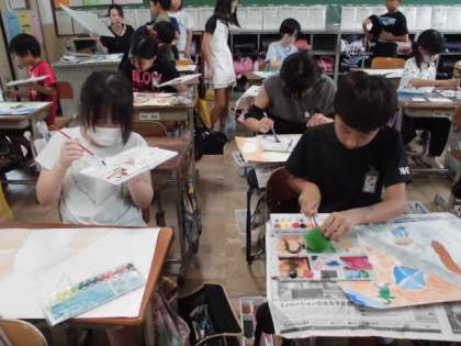 お話に出てくる登場人物の様子や風景を想像しながら描きました。今まで学習した技法を使って、どんな作品になるかが楽しみです。