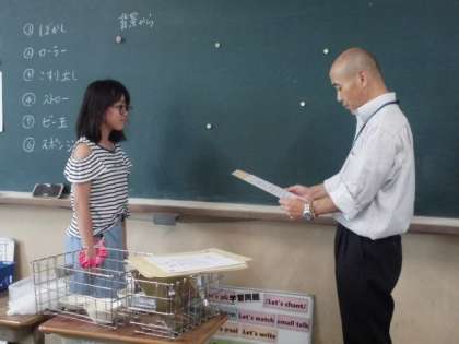 児童朝会で表彰された後に、校長先生から賞状を渡していただきました。