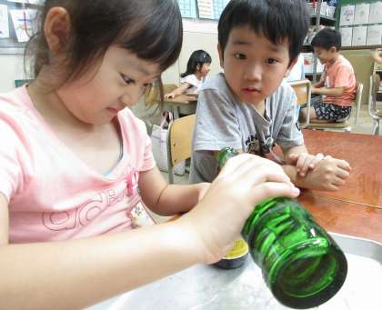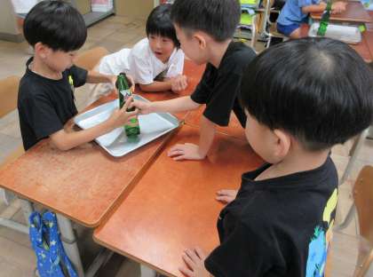 長いビンと太いビン、どちらの方がたくさん水が入るかを調べました。
