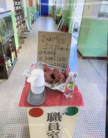職員室前に立派な「さつま芋」が3個飾ってありました。給食室前には「すすき」も飾ってあります。