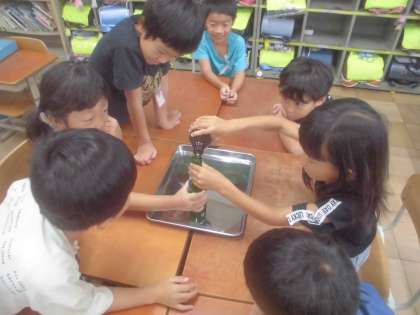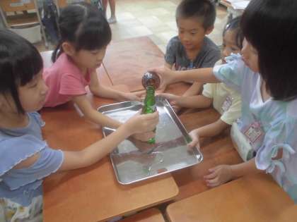 班で水を移し替えて「あふれるかな?」と実際に水を入れてやってみます。