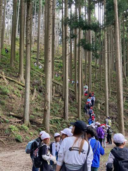 先ほど、目的地の天狗杉に到着いたしました。みんな元気に過ごしています。昼食ポイントに到着し、楽しみの昼食タイムを過ごしました。大自然の中でのお弁当は最高ですね。