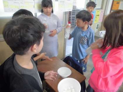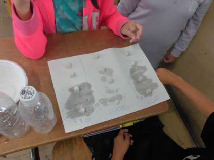 ペットボトルに石に見立てた石膏のかたまりを入れ、50回・200回・500回と条件をかえて振りました。