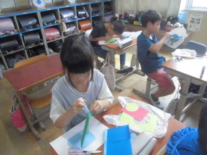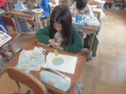 わりピンと画用紙を使って、くるくる回る仕掛けを使った作品作りに取り組んでいます。