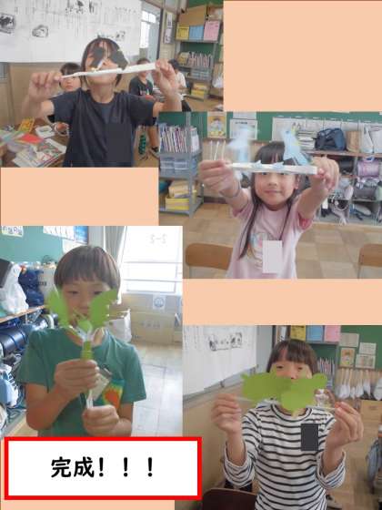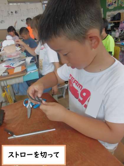 図工科『パタパタストロー』では、動く仕組みをストローでつくって、その仕組みにあった動きの合うものをつくっていきました。ストローの動きをカマキリのかまに見立てたり、ペンギンのぴょこぴょこ歩きに見立てたり、カメが歩いているのに見立てたり。つくることを楽しみながら取り組んでいました。