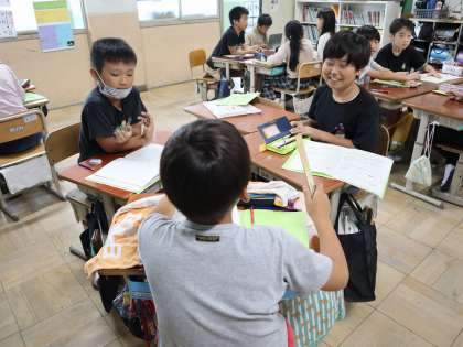 グループで二酸化炭素を減らすための取組と、その取組が実践されるための工夫を会議中。