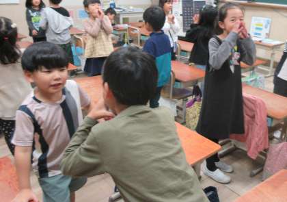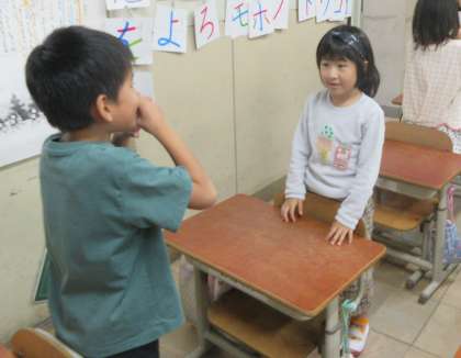 音楽の学習では、「やまびこ ごっこ」の歌いながらまねっこあそびをしています。