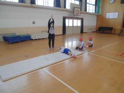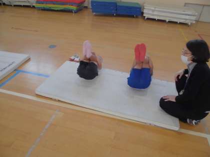 マットの上を転がったり、前転をしたりと、それぞれが挑戦したい技に取り組みました。