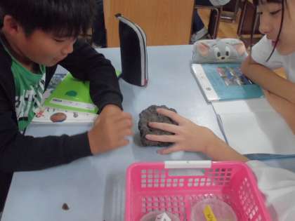 れきや砂、どろ、火山灰。このようなもので地層は作られています。他にも火山の噴火で噴出されたれき(石)や化石なども見たりさわったりしました。