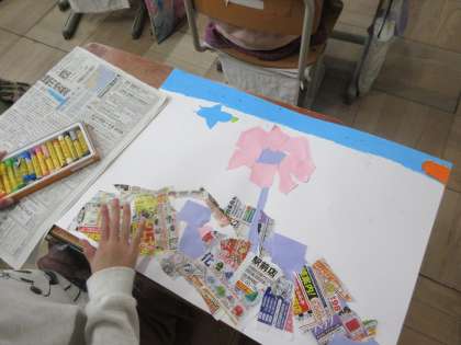 新聞や画用紙を貼って描いた絵に、クレパスで付け足しをしました。