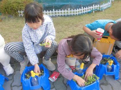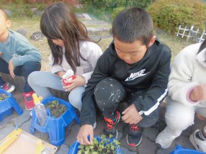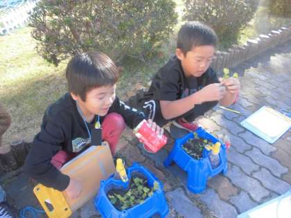 ハツカダイコンの種を植えて約2週間。すでに芽がたくさん顔を出しています!芽が多すぎると1つ1つの実が大きくならないので、いくつかの芽を間引きました。「抜くのかわいそう。」と言っている子たちもいましたが、大きく育てるためには大切な工程です。抜いた間引き菜は食べれるそうなので、火を通して食べてみてください!成長を引き続き見守っていきます。
