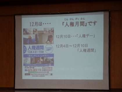 12月は、人権月間です。校長先生からのお話では、なぜ人権月間が始まったのか、人権とは何かについて話がありました。人権とは、「誰もが幸せになる権利」です。今年も残り1か月となりましたが、今年1年を人権の視点で振り返ってみてください。そうすれば来年1年が気持ちよくスタートできると思います。