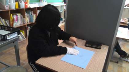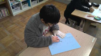 6年生は彫刻刀を使って板を掘ります。
