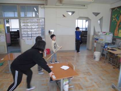 教室をしっかりと掃いて、隅々まできれいに。