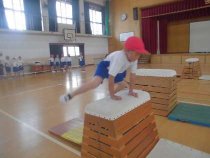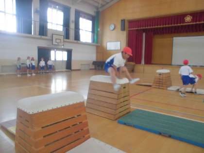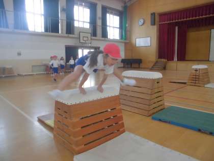 体育科では『とびばこあそび』に入っています。1年生の時に学習したことを思い出して、まず自分が今どの高さを跳ぶことができるのかを確かめました。跳び箱が苦手な人も、大きなマットに向かってジャンプ!次は一緒に跳び箱を跳びましょう!最終的に目指すは全員7段!?自分の目標を決めて頑張りましょう。
