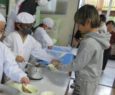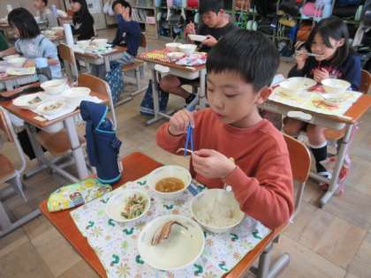 今日の給食は、月に一度のなごみ献立でした。旬の野菜やお出汁など、和食ならではの味わいを楽しむなごみ献立。かぶらの味噌汁を「かぶらが甘くておいしい。」と言いながら食べたり、開き干しさんまを骨の周りの身まできれいに食べたりしていました。ごはんやお味噌汁など、給食の配膳もとても上手になった2年生です。