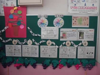 栄養教諭の丸尾先生と一緒にクリスマスの飾りやわっかを作り、飾っていました。